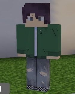 Ryo has gray hair and eyes, with a slit right eyebrow. He wears a forest green jacket over his uniform, with ripped jeans and checkered sneakers.