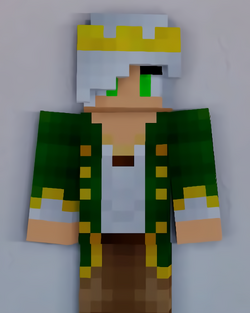 Travis has white hair, with bright green eyes. On his throne, he wears a dark green coat with golden accents, and a golden crown. He wears brown pants, and black shoes.