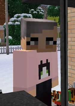 She has short gray hair and gray eyes with bags under them. She wears a pink sweater with a black and white cat on and dark blue trousers with black boots.